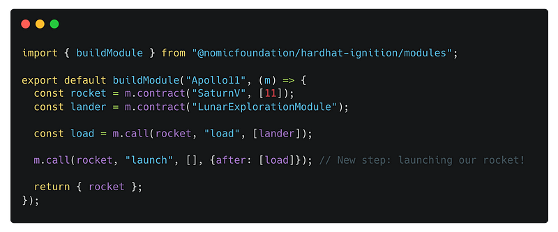 If a completed deployment requires changes, whether to modify the state with calls or to introduce new components, you don’t have to write additional integration code. Simply adjust the modules and rerun the deployment. Hardhat Ignition takes over from there. In the following example, we add a SaturnV.launch call to our previously deployed module.