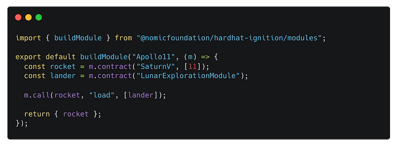 The most fundamental aspect of using Hardhat Ignition is writing deployment modules. Below, we have a simple module defining a SaturnV contract instance that depends on the LunarExplorationModule contract, which we'll provide as an argument to call to SaturnV.load after the contracts have been deployed.